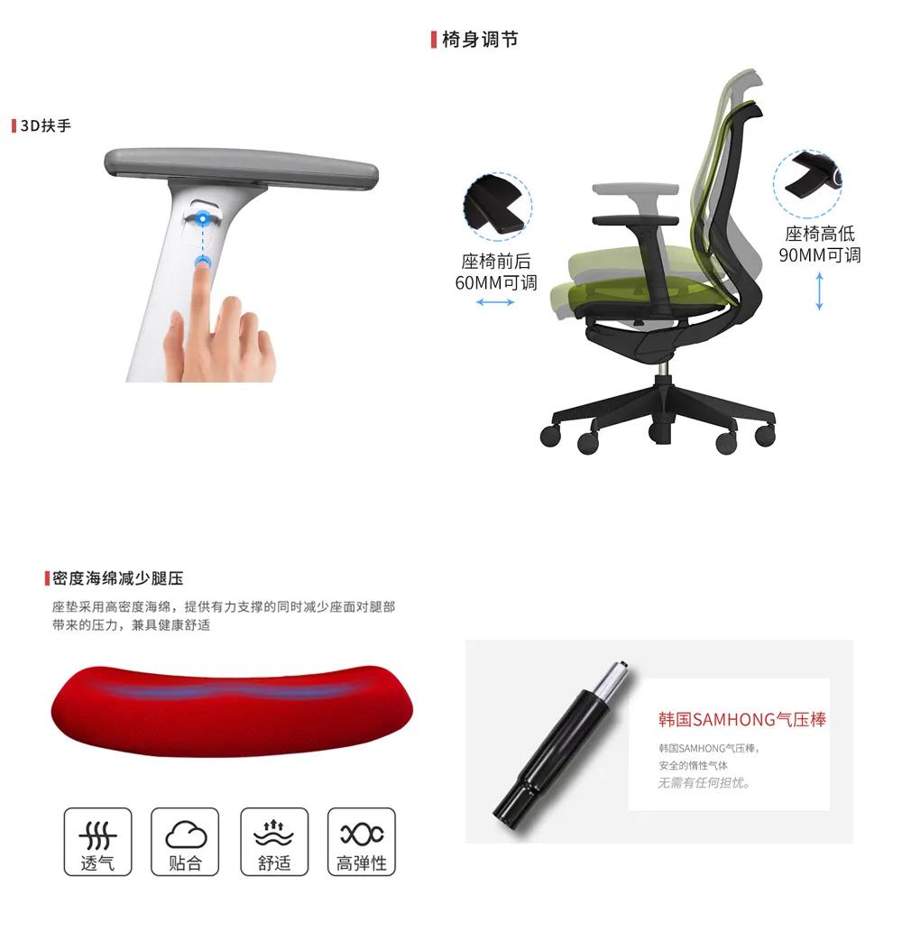 Sylphy Light座垫深度60MM可调、座垫高度90MM可调,适合不同体型人群使用;3D(高度/长度/角度)多功能可调扶手,支撑手臂操作键盘和鼠标;椅背26°四段后仰锁定,适合午休小憩;W型人体工学高密度海绵坐垫减少座面对腿部的压力,兼具健康和舒适;韩国SAMHONG气压棒,安全的惰性气体,无需任何担忧;意大利DONATI底盘,质量优异、功能强大。