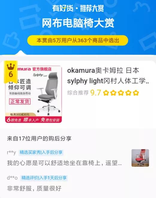 2020年3月30日,Okamura旗舰店的Sylphy Light人体工学椅以9.7分的综合推荐评分荣登天猫“有好货·推荐大赏”——“网布电脑椅大赏”榜单第六名。“网布电脑椅大赏”榜单是由阿里系5万名用户从363款座椅商品中选出,截止发稿日止,日本Okamura奥卡姆拉是此榜单中唯一上榜(前10名)的国际办公家具品牌。