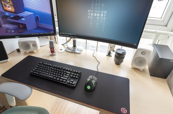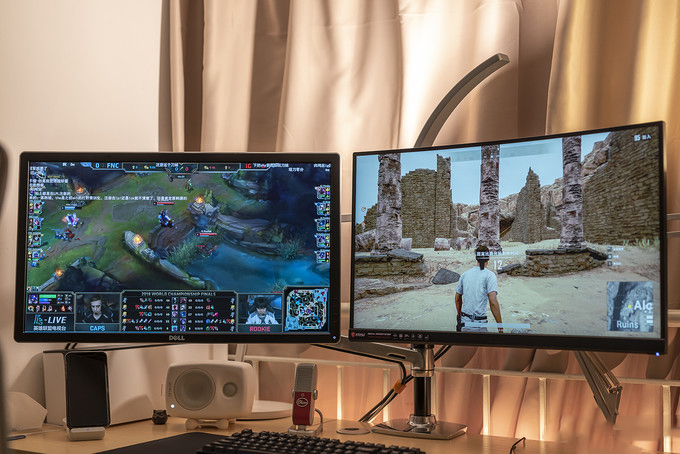 一水桌面外设,既是生产力工具也是娱乐工具、工作台,因为显示器调整下右半边区域就可以用来摆拍了。右边是主力游戏显示器,左边的旧显示器目前主要拿来看资料,过一段时间也准备换掉了。