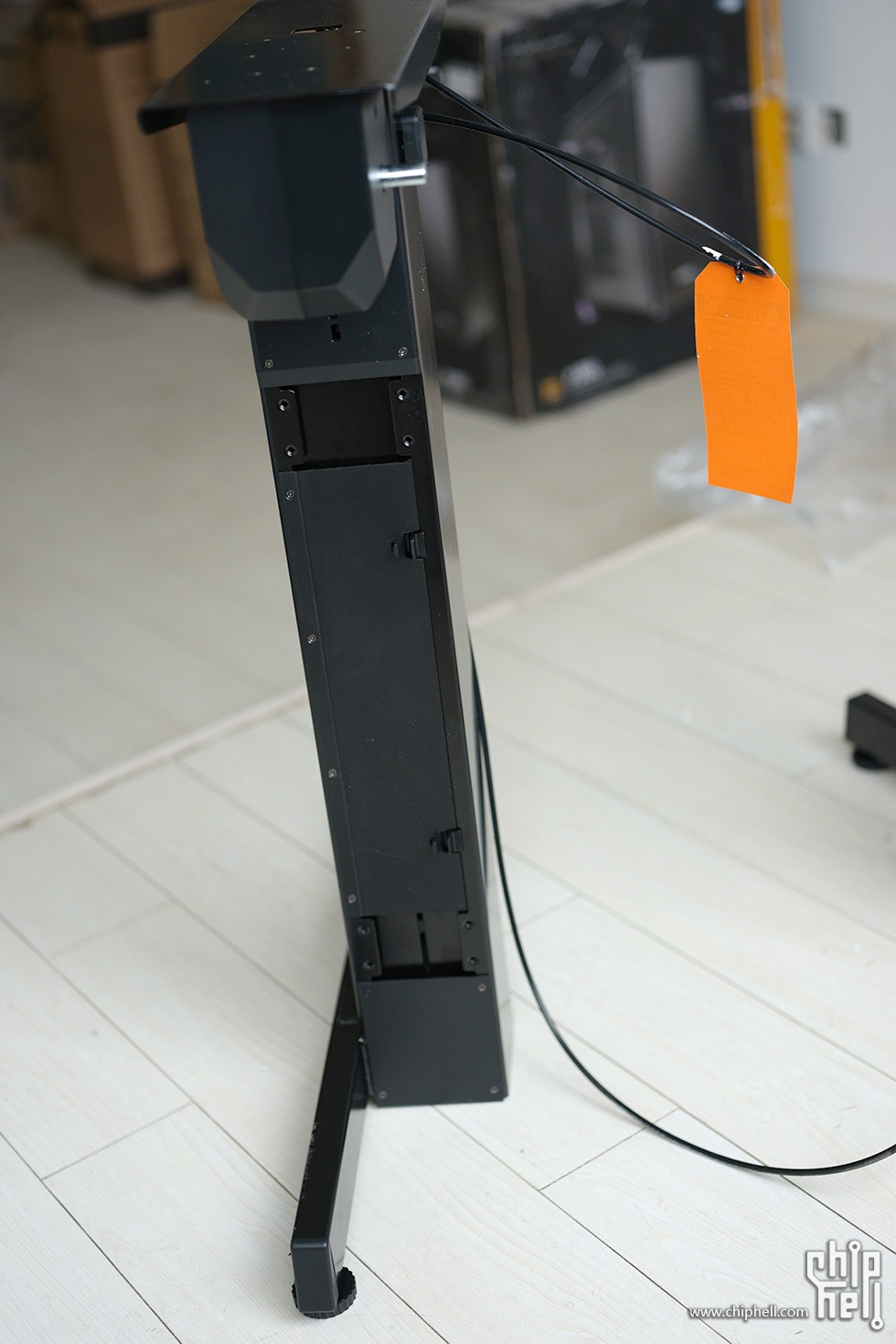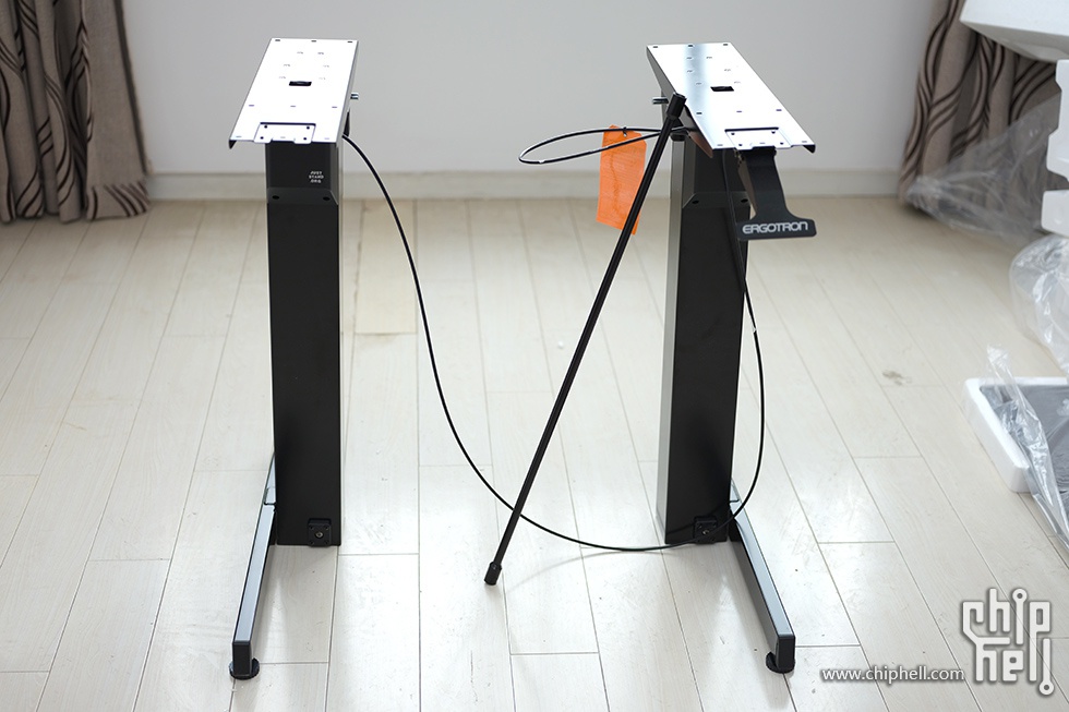 首先来安装支架,先上右腿,升降手柄对准位置