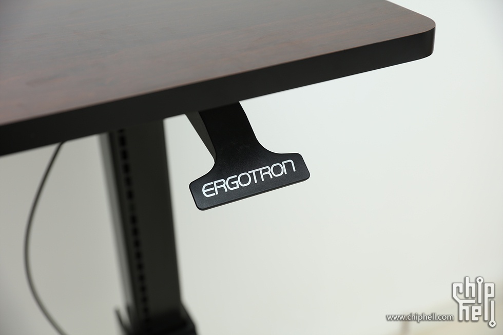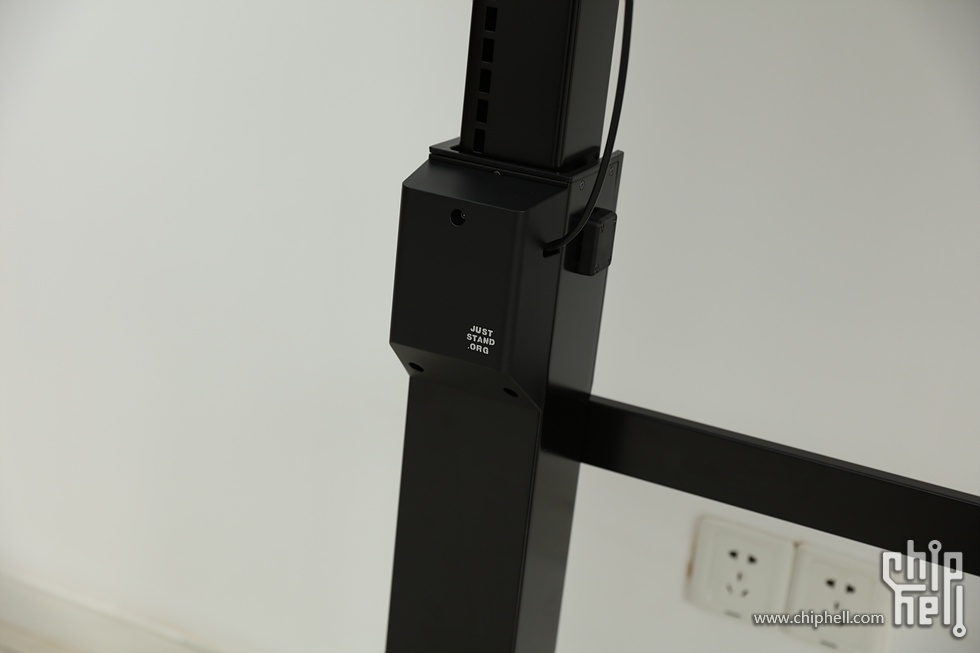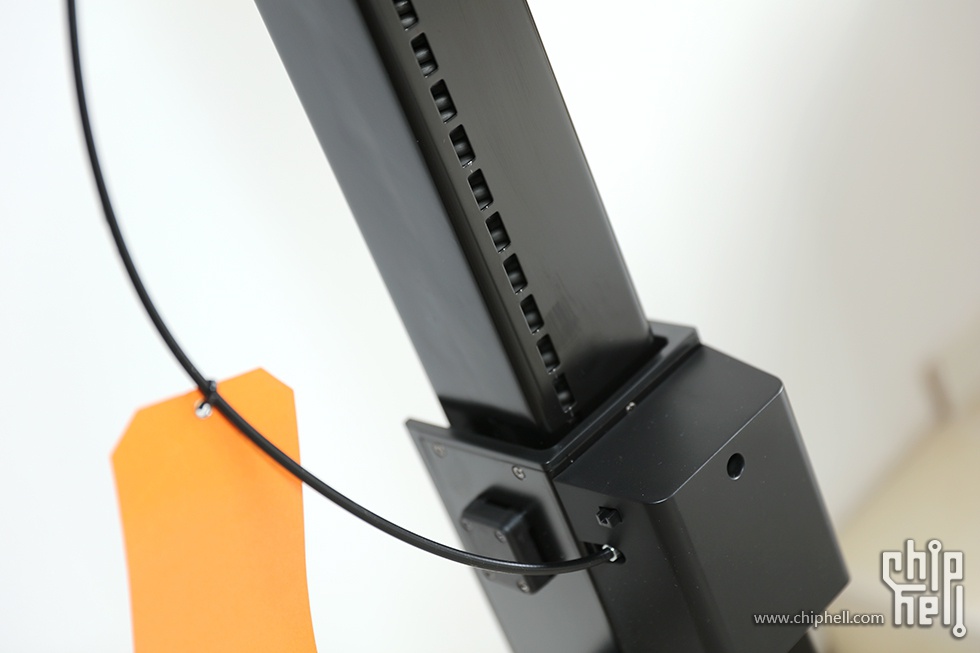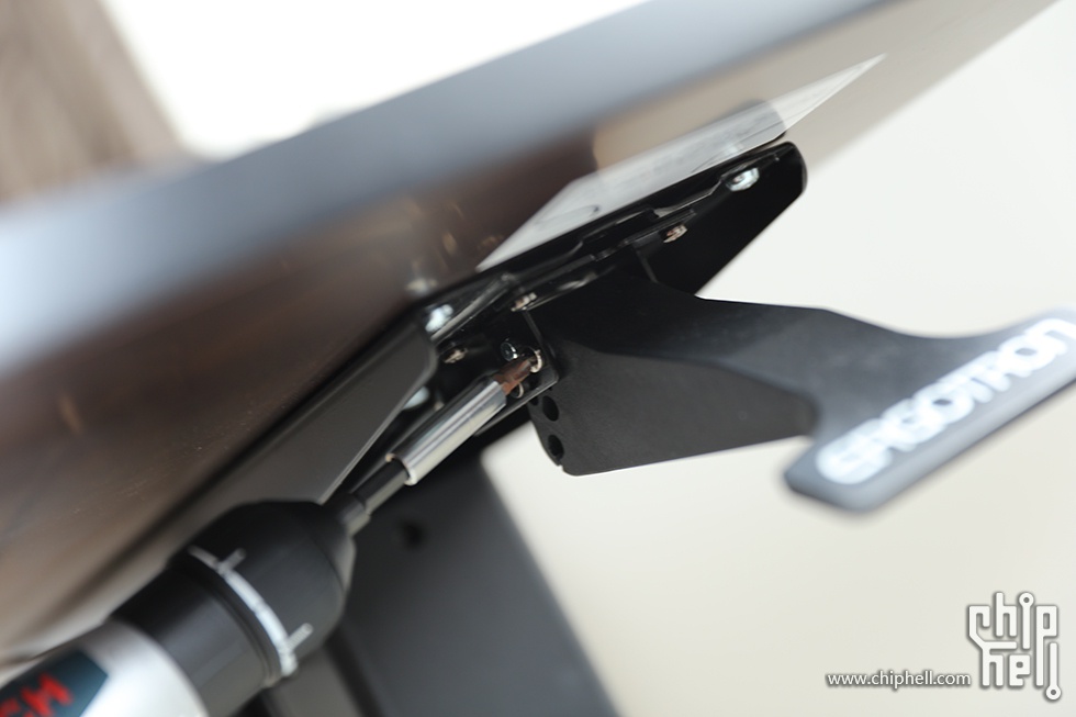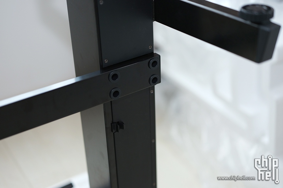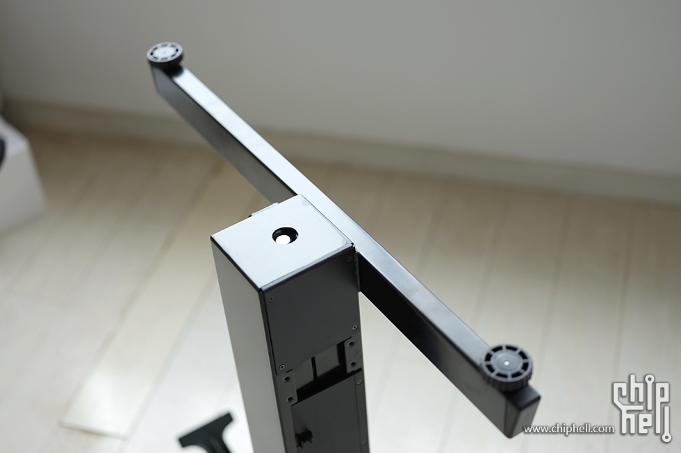 美中不足的一点就是,升降桌不能像气压椅那样无极锁定,撑脚通过两侧小孔来锁定,这样的后果就是会有死区,固定状态下用力下压,桌子还是会下降一丢丢