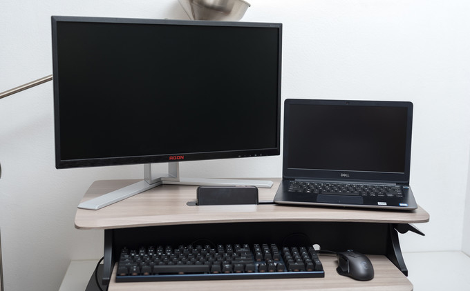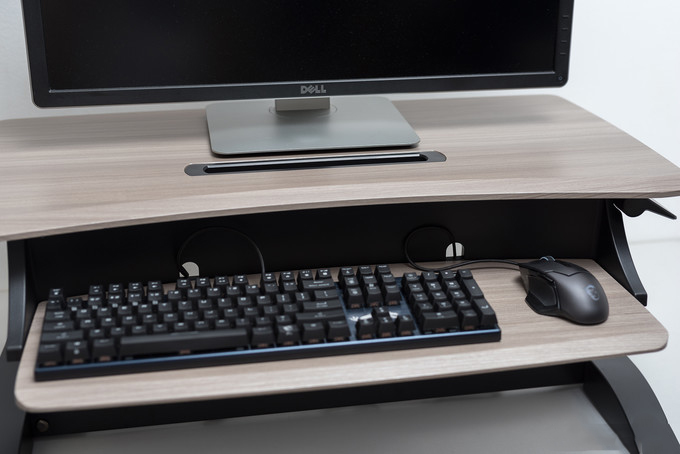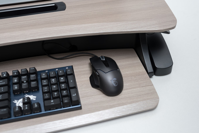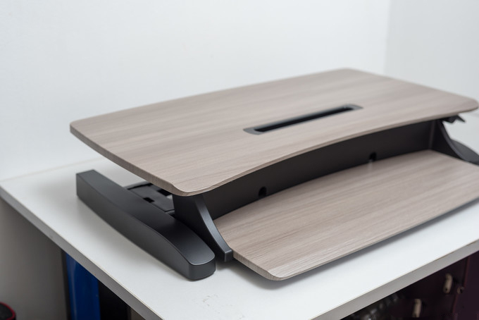 装好之后放置桌面的示意,我用27寸的显示器试了下,如果是单显示器的话,基本刚刚好(窄边框),如果是超窄边框显示器就更适合了。另外示意下升降高度,高度兼容性是ok的,我估计哪怕2米的用户也没问题。另外我发现有不少用户在选购升降桌之后依旧有一个使用误区,一般靠谱的升降办工作都是分层分高度设定,就是操作区域(键鼠)跟防止笔记本显示器的平台,是有高度落差的,这并非是为了刻意堆料、弄复杂或者噱头,而且是为了在正确站立姿势情况下,视线保持一定高度同时,手肘与手臂也会自然形90°左右的角度,避免姿势不对导致的关节损伤抑或低头压迫。但现实是不少人不知道这点,买了升降桌,放着好好的落差操作区域不用(甚至不安装好),然后用最上面的面板作为操作区域与显示器置放,白白浪费了别人的设计不说,最主要的就是反倒影响自己健康。