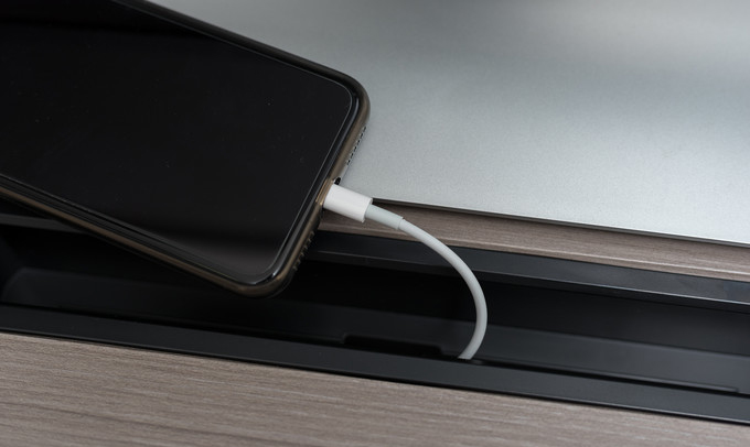 相比于旧款改进点之一,增加了这个智能设备置放槽,可以放手机、平板等只能设备,而且开了一个空可以接数据线。