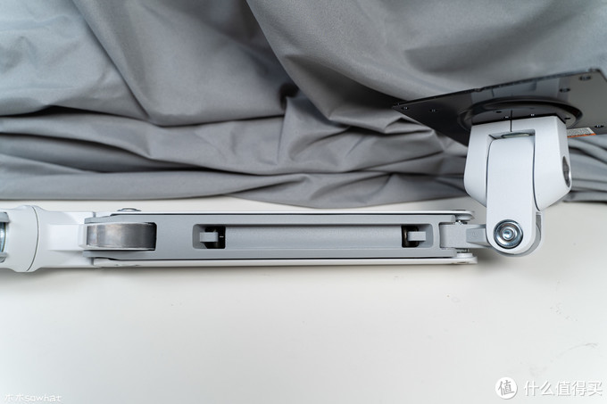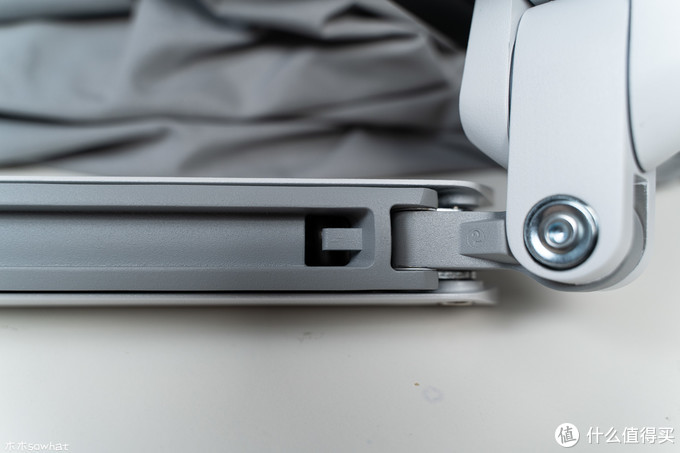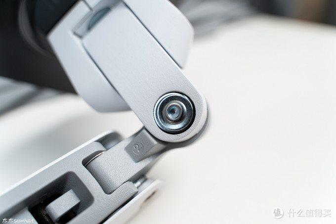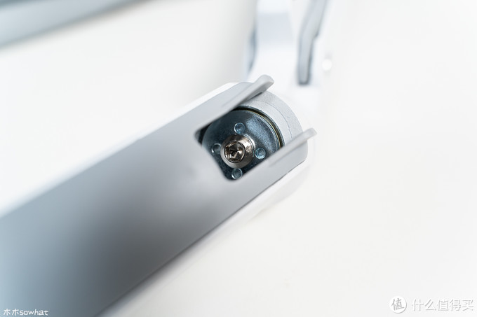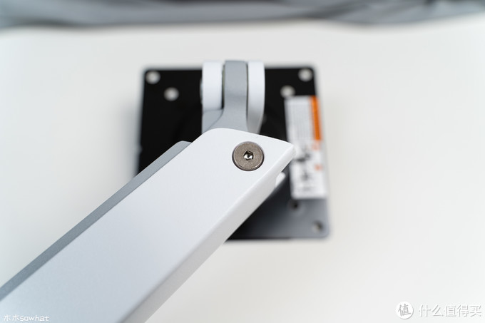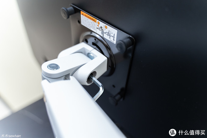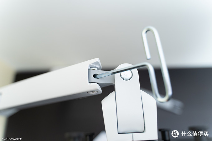 接下来发现显示器比较容易往下沉,这里需要调节支架上臂螺丝的松紧,先将支架提起一些,用随机附带的工具向右拧紧,直到显示器可以轻松的固定在任意位置。