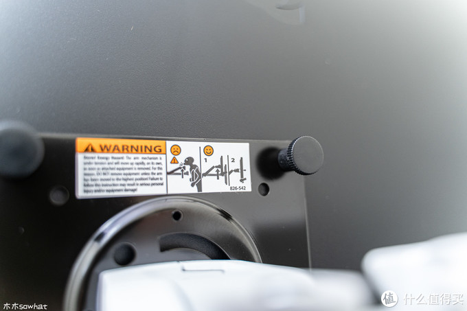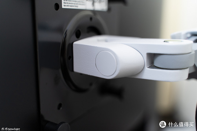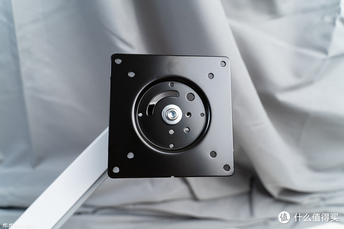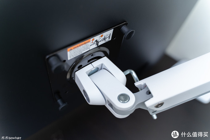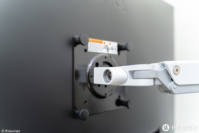 VESA标准支架版上有两种尺寸的开孔,可以支持75X75或100X100mm两种规格的VESA支架,上面有安全提示,提示使用者小心别被弹起的上臂支架击伤。