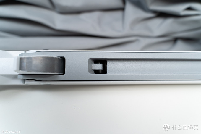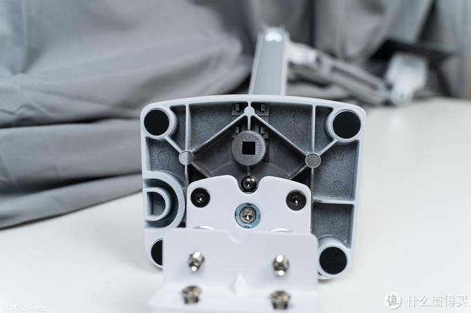 支架下部很粗壮,目测也是铸造材质,重量很足,内里同样采用加强筯设计,进一步增加支架强度,上面覆有一个塑料片,可以用将显示器线材藏在里面。