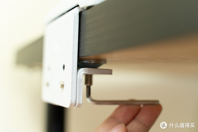 先将底座卡在桌面上,拧紧螺丝就OK了,针对不同厚度的桌面,底座也提供了多种孔位和延长螺丝供匹配。