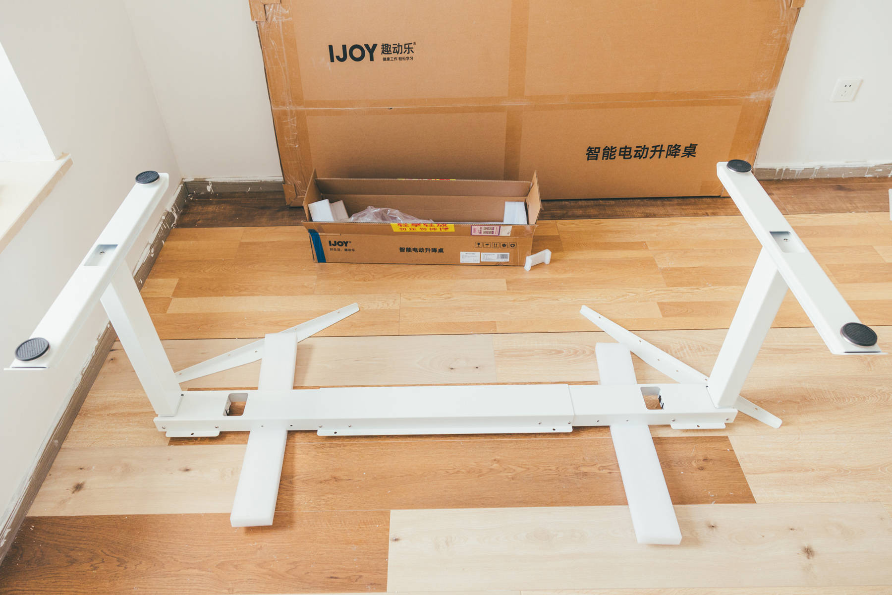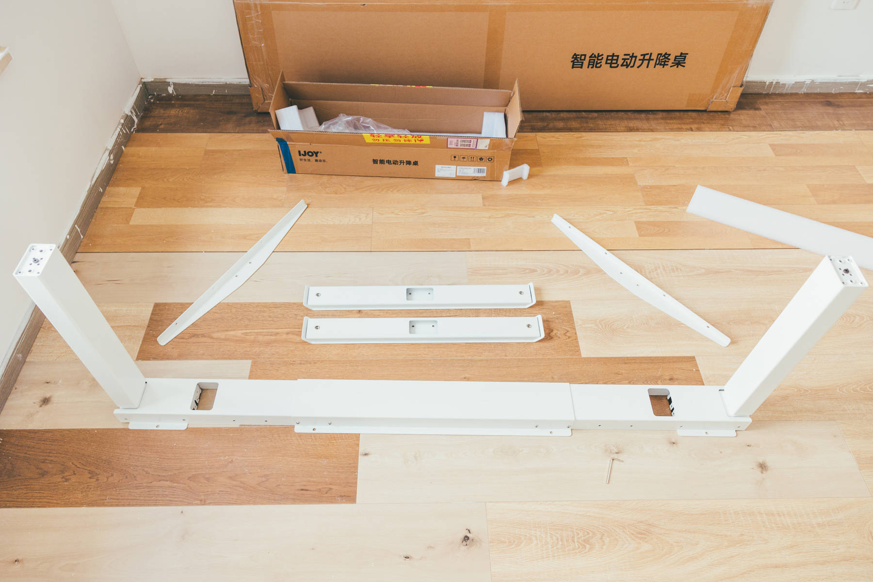 安装桌板和控制器,桌板本身就预埋了螺母,螺丝也均为不锈钢材质,安装非常轻松,整个桌板提供了16个螺丝用于固定。