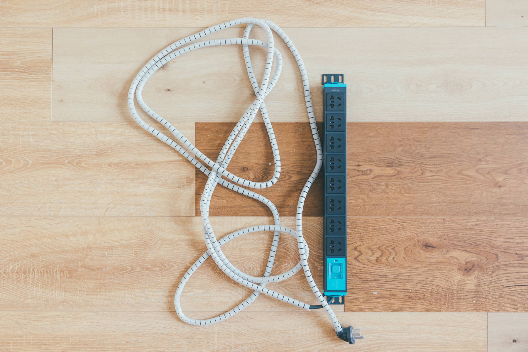 我选择搭建桌面工作台的这一面墙体没有任何排插孔,所以选择了公牛的机柜排插,长度5米,外加最细的电源线收纳束线管,将电源线的黑色隐藏掉。