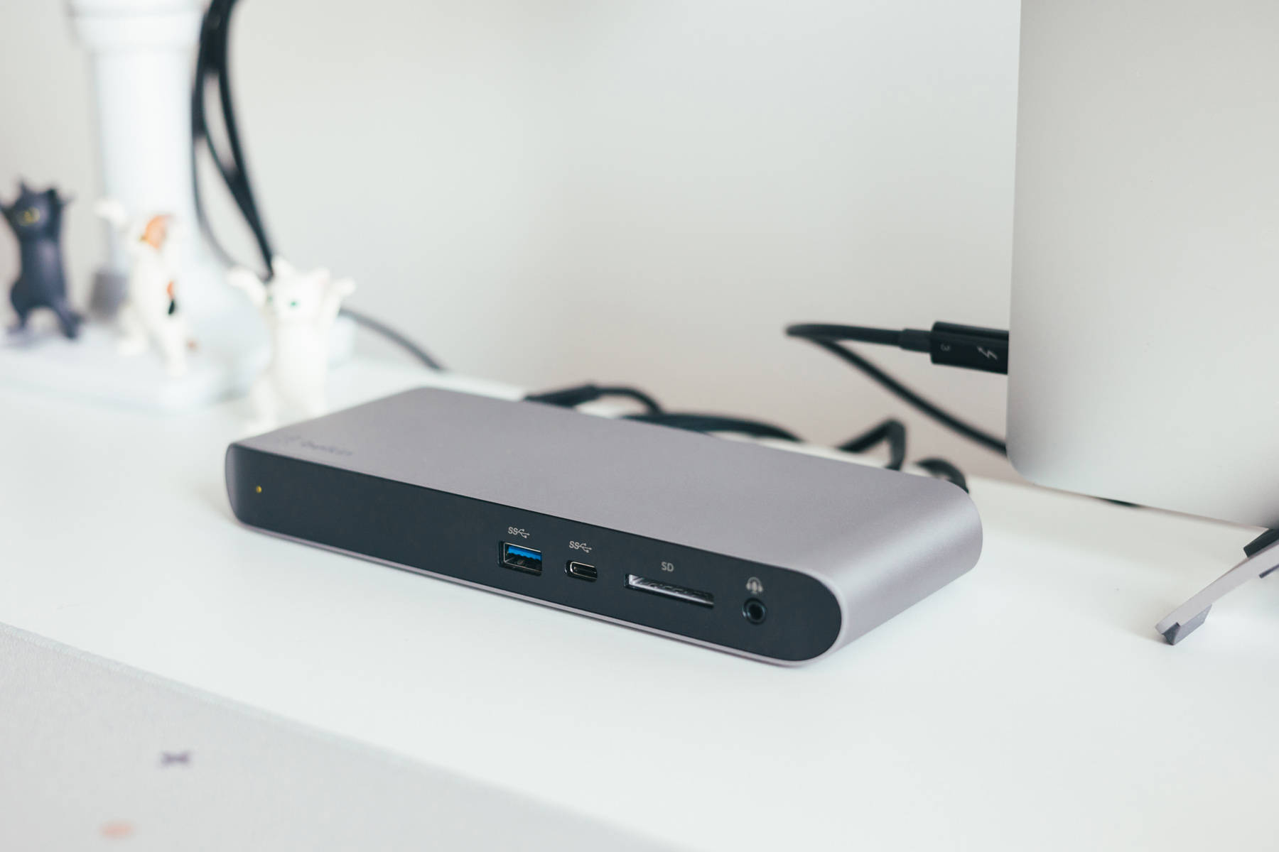 雷电拓展坞来自贝尔金,只是一款我非常满意的拓展坞,前置接口合理明确,包括了一个USB-A,一个10Gbps的C口,一个读卡器以及一个3.5mm接口,使用的时候非常顺手。