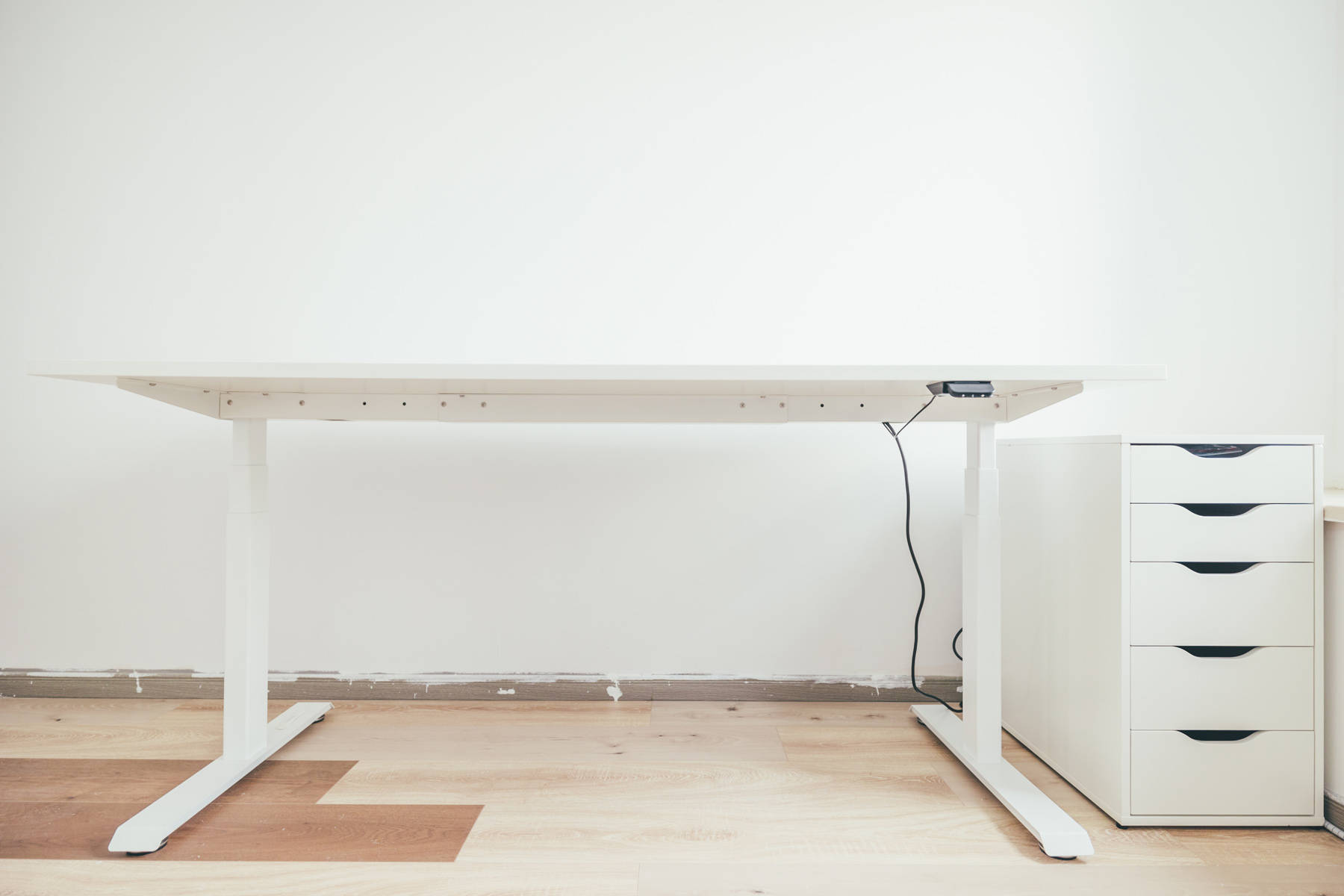 将宜家ALEX 阿来斯抽屉柜置入升降电动桌右侧,公牛的机柜排插用3M胶粘贴到抽屉柜背部,顺便用为抽屉柜开一个孔,抽屉柜第一层我规划为充电基站,绿联的100W四口充电器隐藏在这里。