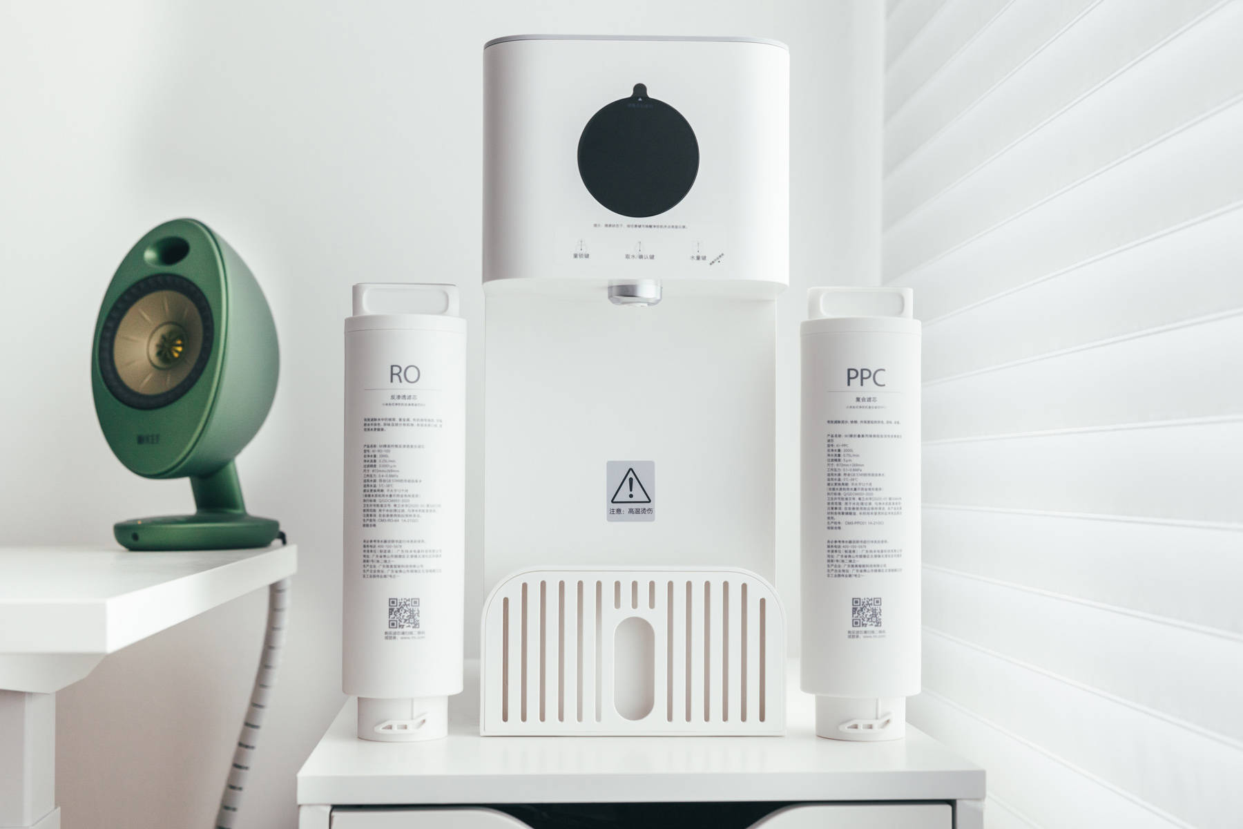 小米台式净饮机的滤芯为两根, 分别为PPC复合滤芯和RO反渗透膜,这种双滤芯的配置,在400G通量的小米净水器1A上也能看到。