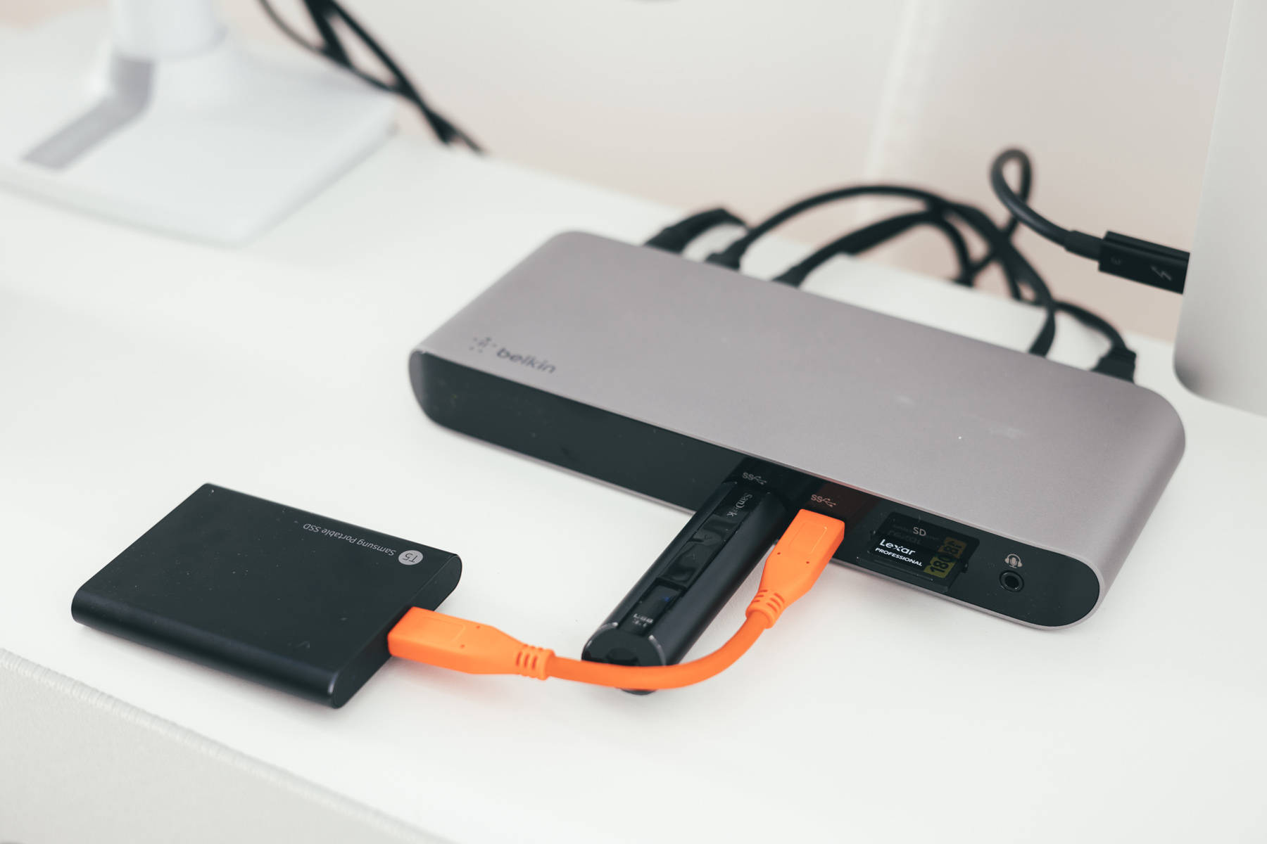 而我使用的三个固态移动硬盘有两个都是读写10Gbps的,可以直接用贝尔金的前置接口连接上使用,非常方便。