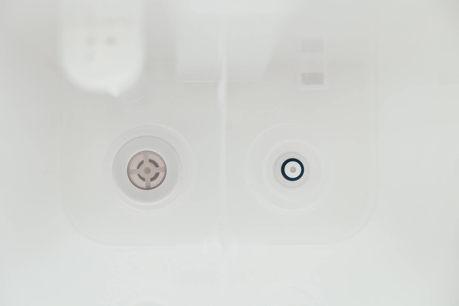 5L水箱底部是进出水口各一,左侧带滤网为进水口,右侧为排出净化后废水的出水口,中间有个并不高的挡板。