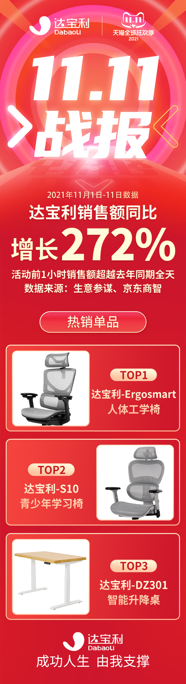 据官方统计,2021年双十一期间(11月1日-11日),达宝利智能工学家具在各电商平台上的销售额同比增长272%,活动开始前1小时销售额即超越去年同期全天。达宝利旗舰店自2016年在天猫、京东开业以来,已连续5年保持高速增长的销售记录,描述相符、服务态度和物流服务三项店铺动态评分长年维持在4.9分以上,普遍高于行业平均水平。