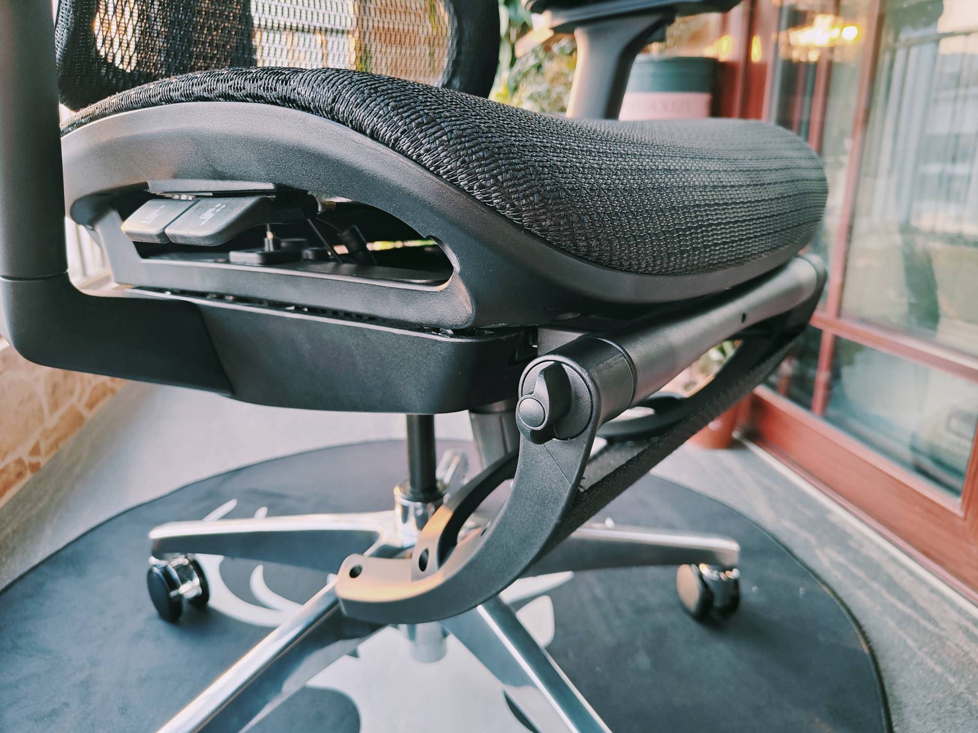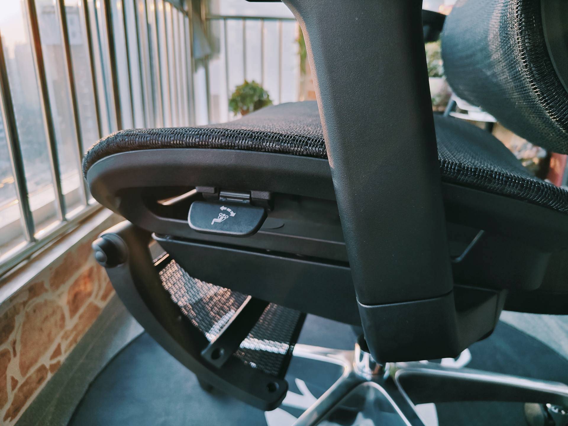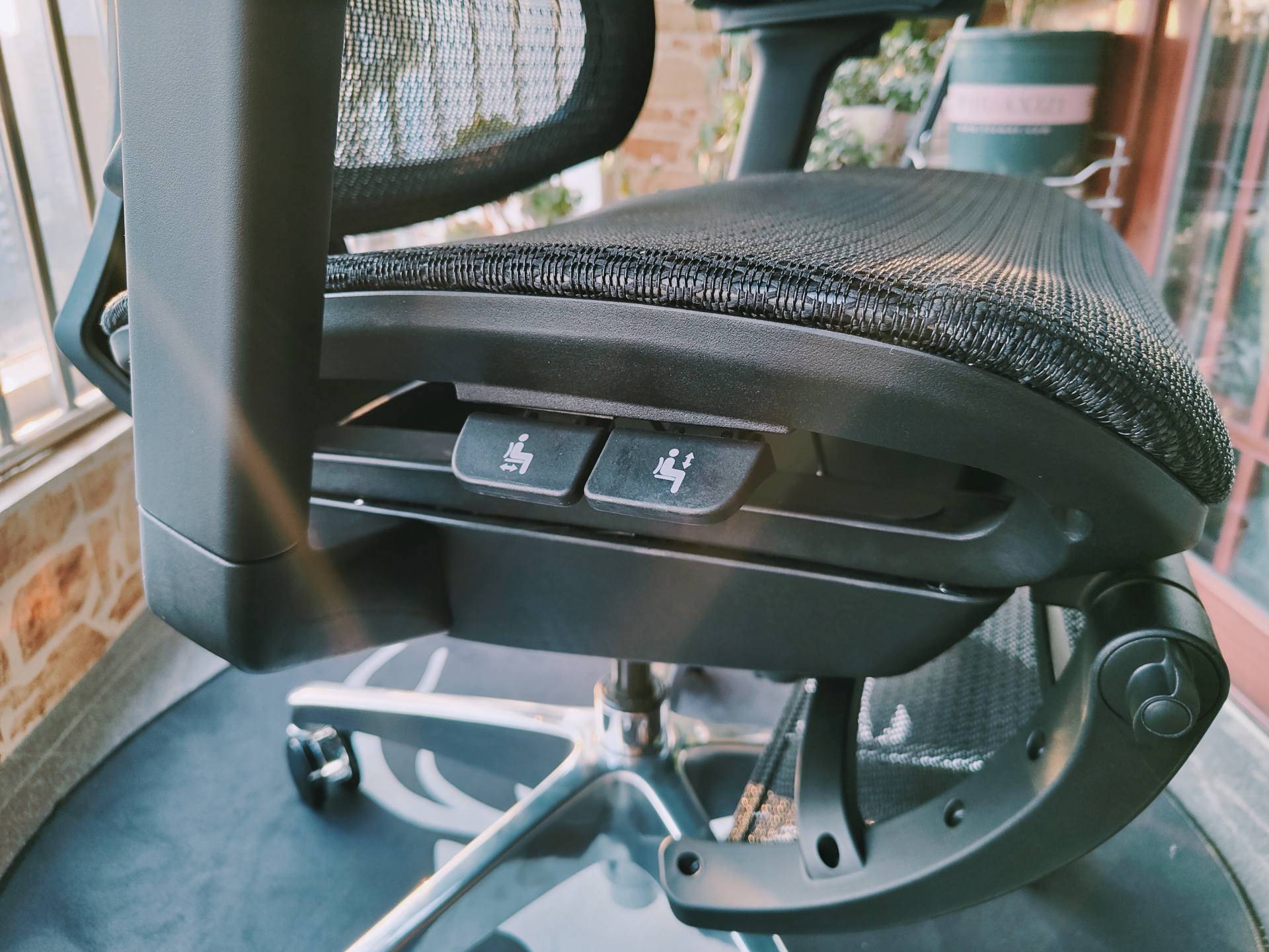 坐垫部分弧度设计得很合理,可以很好地分散臀部和大腿部的压力,久坐不累。而且坐垫的高度和进深都可以进行调节,调节的拨片都在坐垫的右侧这里,上面有图示,应该不难看懂吧?