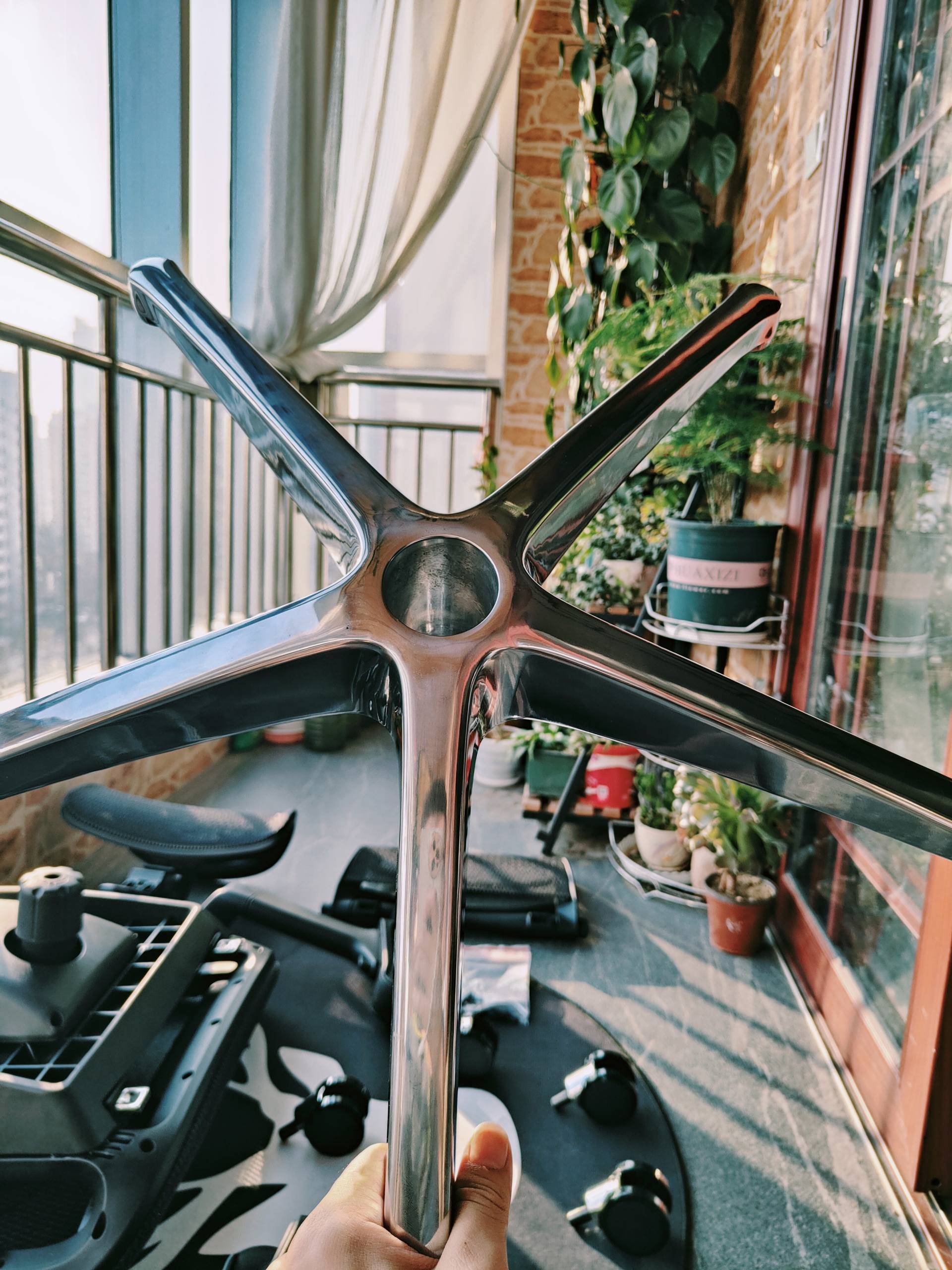 一体浇筑的铝合金五星脚做工非常精细。五星脚一般是钢制、尼龙和铝合金三种材质的,其中铝合金材质的强度最高,相对也不重,只是相应的造价也要高很多,所以看一个电脑椅的价位看它的五星脚材质应该是最直观的了。像这个铝合金五星脚静压承重足有1360KG,就是让世界上最重的人来也压不垮它。
