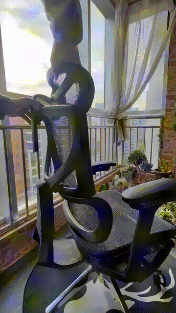 通过下面这个动图不难看出这款人体工学椅在后仰时2采用的是一体式的联动设计,扶手的角度和腿托的角度都会跟着靠背一起后仰,各部分都有更好的承托。全程中靠背也是一直贴合着腰背部,没有出现腰部悬空需要另行调整的情况。靠背后仰的力道也是可以调节的,在底座下面那个旋钮就是,这个调好以后就用不到了。