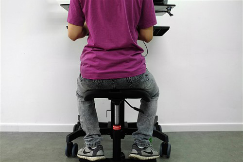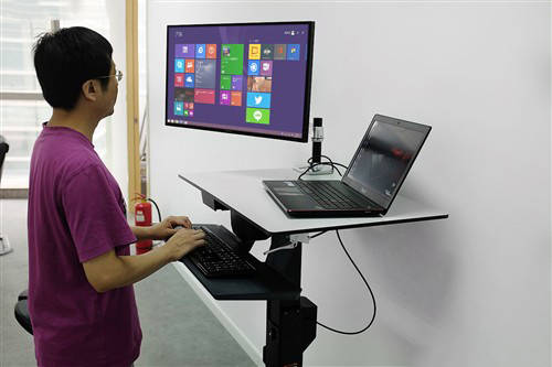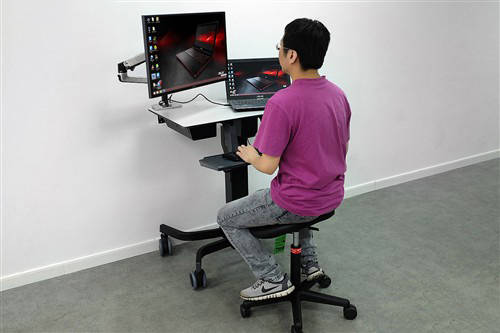 马鞍椅虽能改善办公坐姿,但是并不能完全排解掉身体下半部因长时间乘坐带来的疲劳和血液阻塞,所以在坐立办公一段时间后,我们可以将桌子升高到合适的高度,然后调节显示器角度来进行站立式办公。因为人在站立状态下,身体血液循环是最畅通的,所以站立式办公很有必要,也是未来的流行趋势。