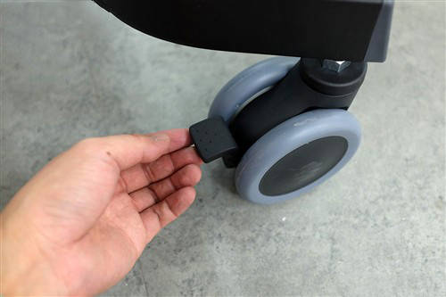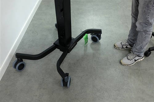 这款爱格升站坐式升降桌不仅支持升降,而且还支持挪动,底部支架共配有四个PU滚轮,其中前面两个还带有锁死开关,缩上后就不用担心桌子在使用中会轻易变动位置了,是一个足够保险的设定。
