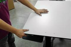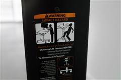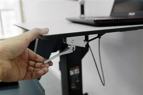 需要特别注意的是,扳动高度调节手柄时桌面上升速度很快,如果人离桌面很近的话有可能发生磕碰危险。正确的操作方法是使用者和桌面保持一定距离,然后一只手扳动手柄,一只手按压在桌面上来降低上升时的冲力。桌面下方黑色支架上的危险示例也在时刻提醒用户,升降调节操作时一定要注意安全。