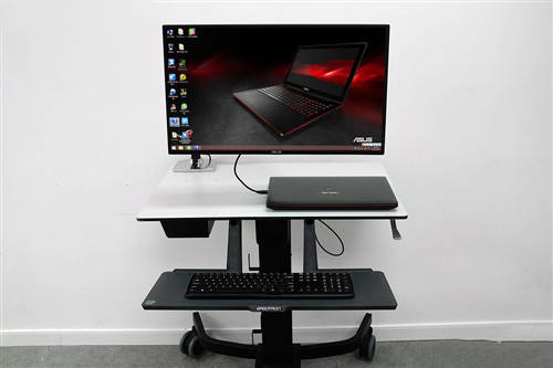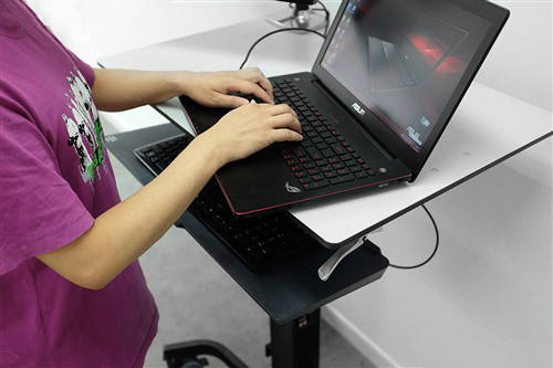 站立状态下除了可以继续在键盘托架上办公外,也可以选择直接在桌面上进行操作,不过这些取决于使用的PC设备以及使用者自身的习惯,所以并没有定数。(图中演示笔记本机型为华硕ROG G550)