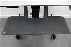 升降桌下方还配有用来放置键盘的可伸缩托盘,和桌面宽度相差不多,可以轻松放下全按键键盘和鼠标。这个托盘并不是简单的前后伸缩,而是根据成年人的使用习惯进行针对性设计,往外伸展时角度会有一个轻微朝下的曲线变化。
