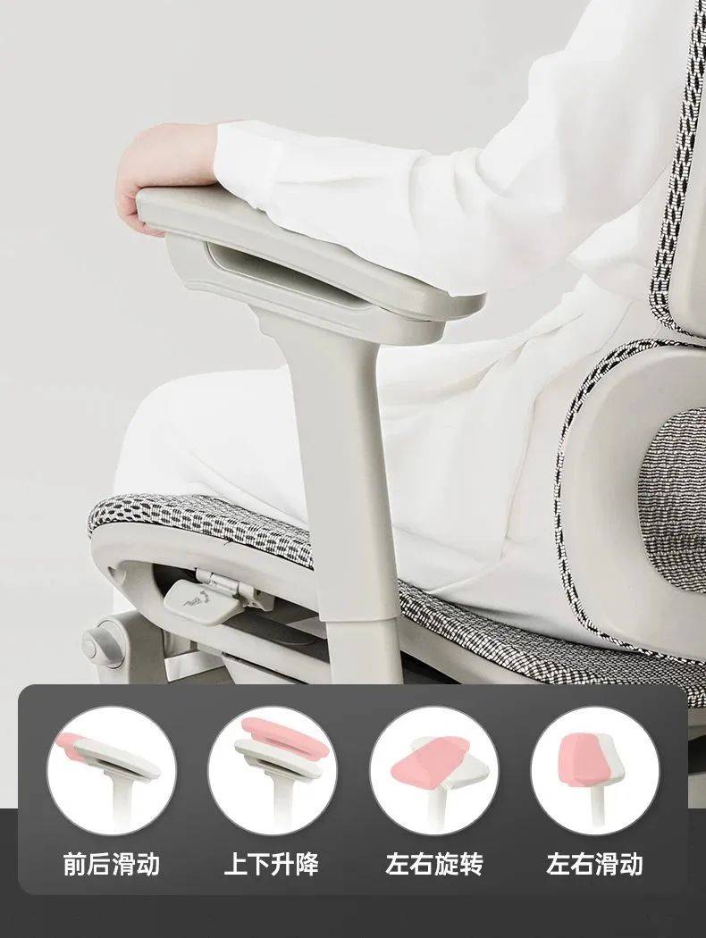 4维调节灵动扶手,升降、前后、平移、角度调节,适应手臂摆放全需求。