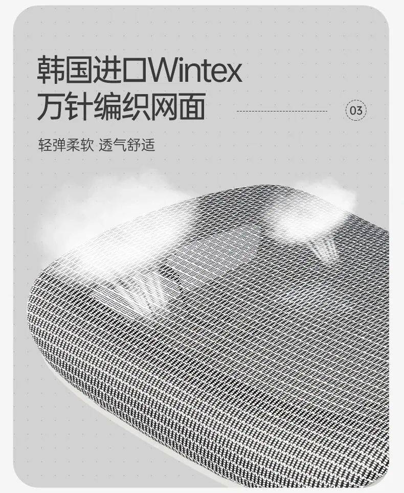 Ergosmart的主要承重材质选用韩国进口的Wintex万针编织网面,轻弹柔软,透气舒适,适合久坐。如坐云端的轻盈感受,使得专注久坐成为可能。