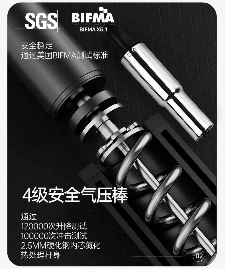 家庭使用产品尤其注重安全。Ergosmart采用几乎是民用最高等级的4级安全气压棒,通过SGS和BIFMA国际测试标准,热处理杆身,2.5MM硬化钢内芯氮化,轻松通过12万次升降测试和10万次冲击测试,安全无忧。