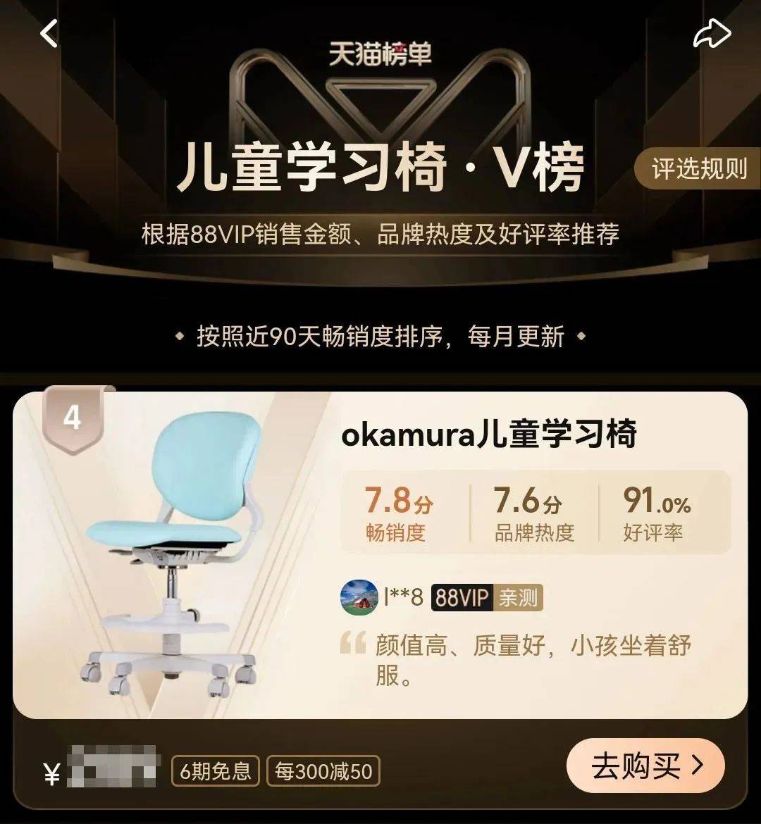 2022年双十一期间,伴随着销量的巨幅增长,Stella入选天猫榜单“儿童学习椅 · V榜”,名列第四。