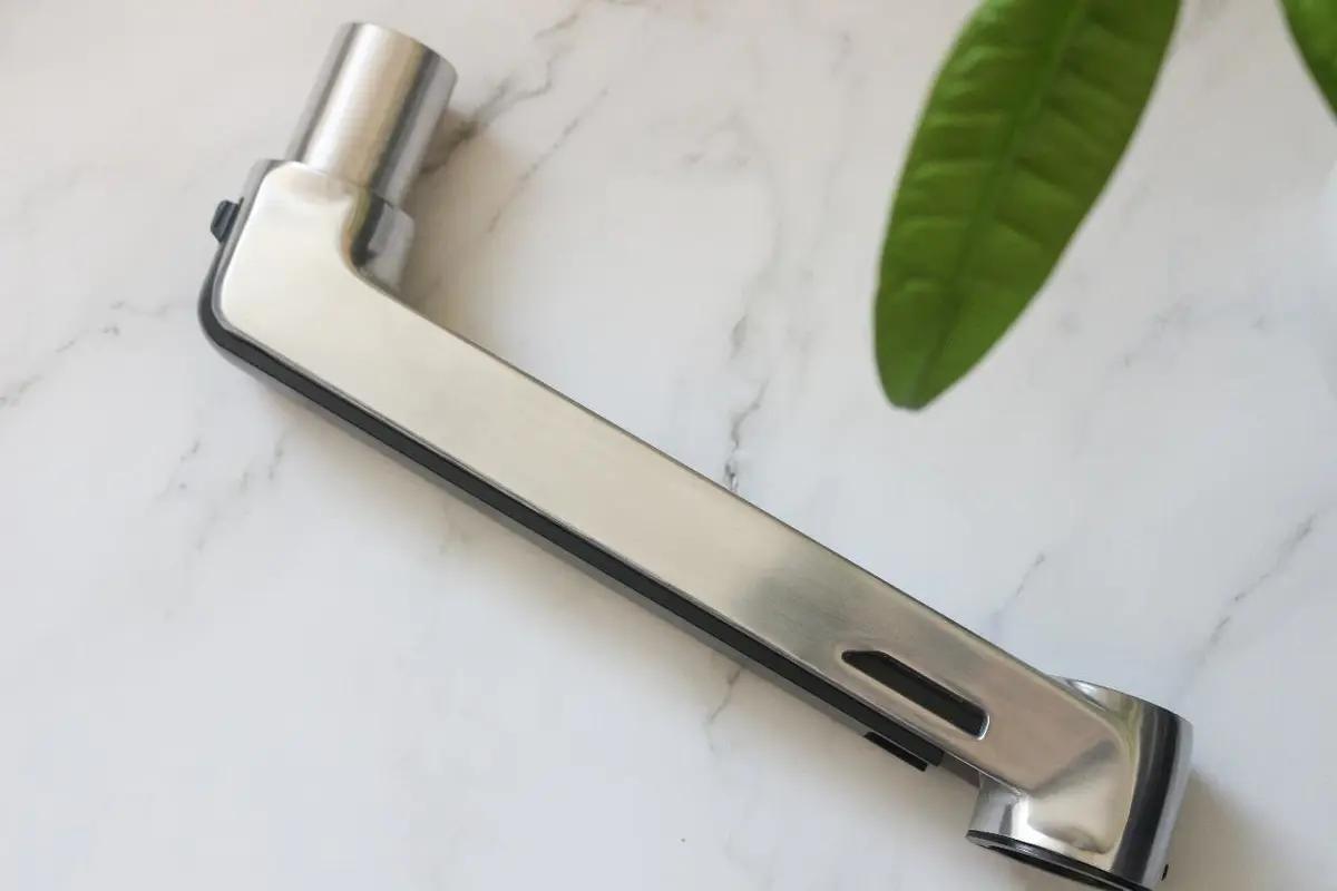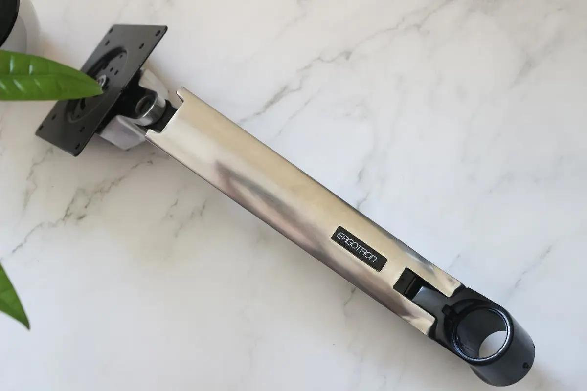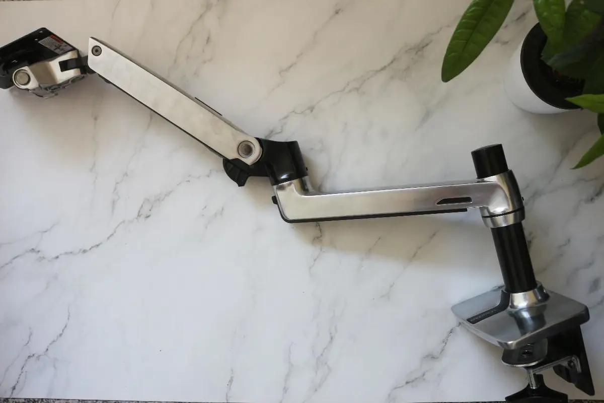 延长臂,36CM,用于连接底座和主体,主要作用是延长伸展范围,两头可以360度旋转,底部孔位用于调节高度。采用抛光铝的材质打造,臂内有线槽走线,可以保障支架的整体美观性。