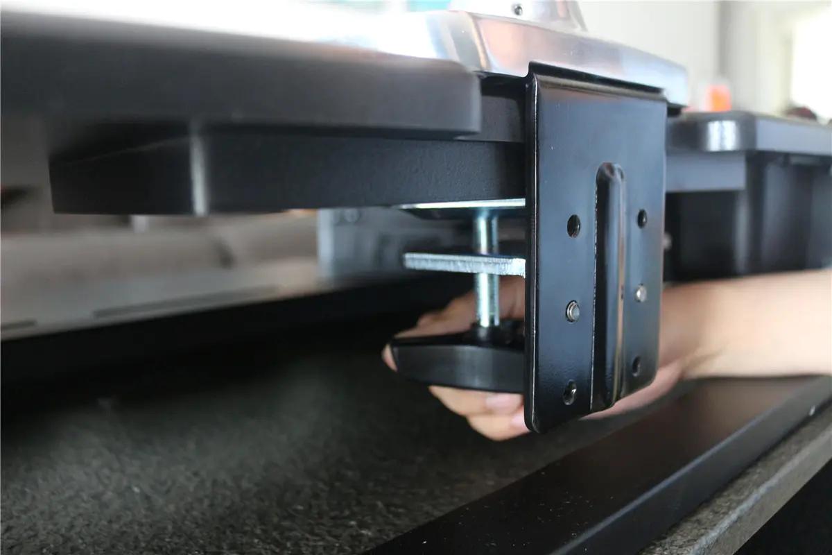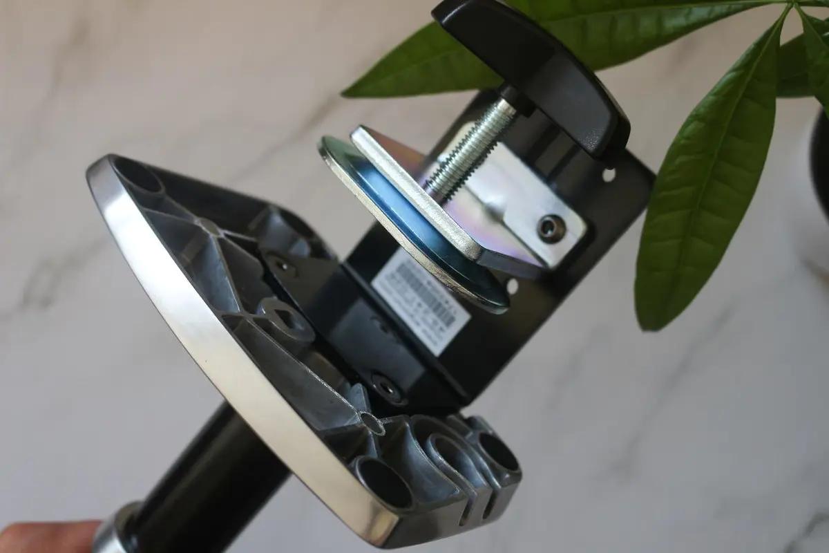 首先第一步将底座固定到桌板上,这里用户可以根据桌板的厚度调节夹片的高度,通过手拧固定即可。
