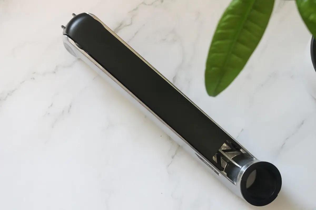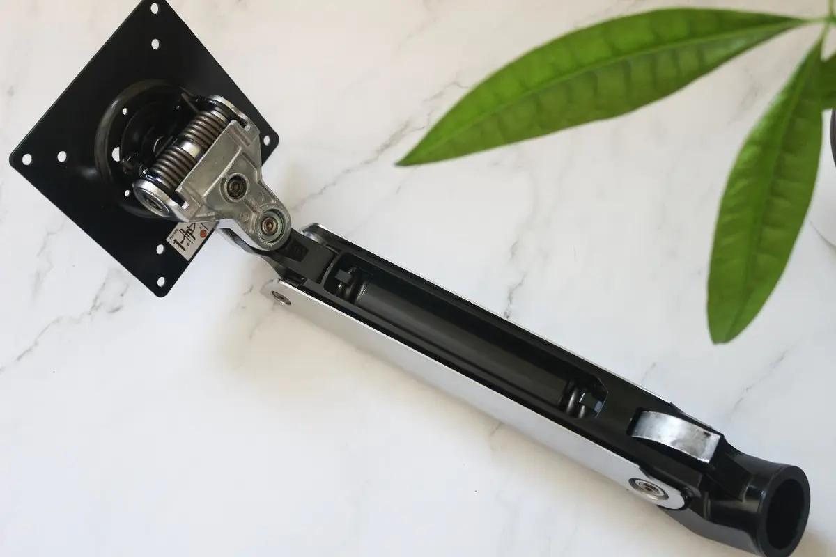 显示支撑臂底部印有产品的LOGO,整体采用流线型的设计,加上抛光铝材质的金属质感,拿到手里沉甸甸的,从反面的卡槽可以看到机械弹簧粗实有力,给人一种稳重感,为支架最大可以支撑和悬停11.3KG(10-34寸)显示器提供了强有力的保障。