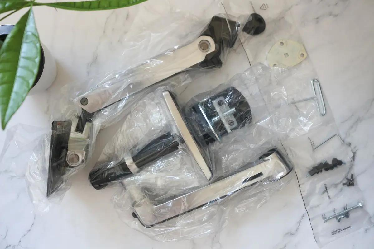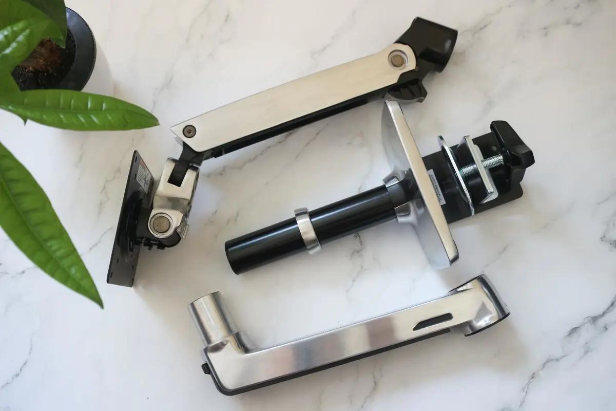 从上往下依次为支架的显示支撑臂,底座,延长臂,从表面可以看出支架采用坚固耐用的抛光铝结构材质,金属质感十足,从锻造工艺精致,符合爱格升的产品定位。
