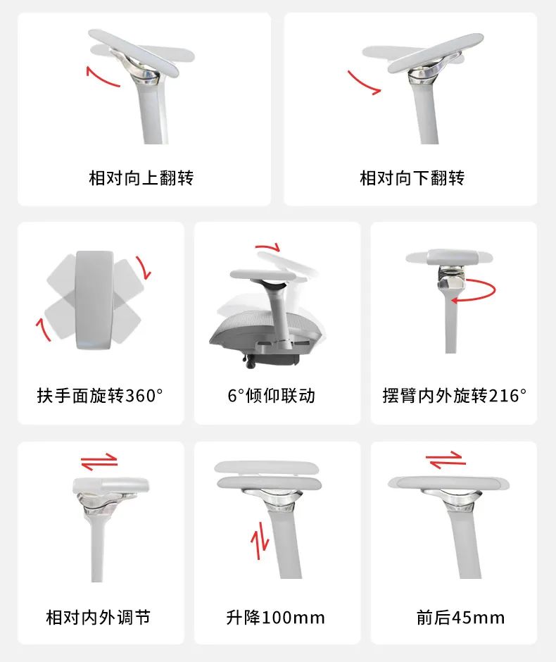 前后调节:扶手的前后调节可以帮助我们更靠近桌子,为小臂和手腕提供支撑,从而放松肩部。两个扶手调到和桌面持平的位置,可以实现肩部和手肘自然的放松状态。