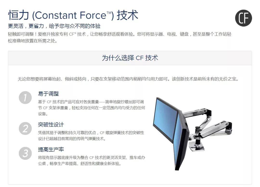 爱格升的显示器支架系列产品均采用了自主研发的恒力(Constant ForceTM)专利技术。此技术可以让用户轻松地将显示器、电视、键盘,甚至整个工作站悬停在所需要的位置。当用户需要将屏幕抬起、倾斜或转向,只要在支架活动范围内稍稍均匀用力即可。