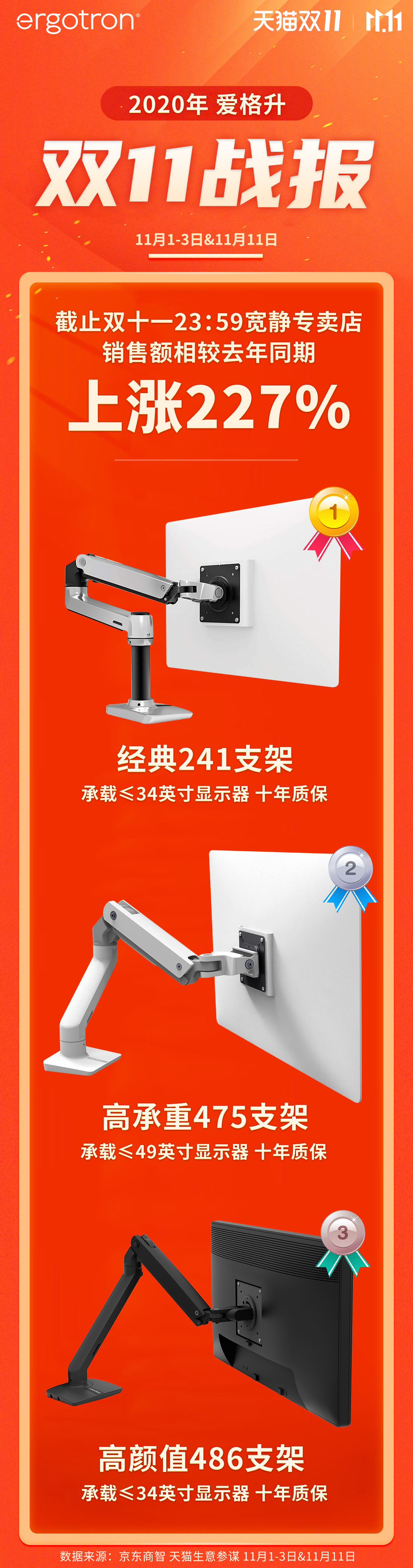 2020年的双十一结束了,在刚刚结束的双十一大促中,天猫、京东平台上的爱格升宽静专卖店收获颇丰,以往爱格升的45-241-026一直是独占鳌头,但今年爱格升45-475-026 、45-509-216、45-486-026几款显示器支架也很受欢迎。经过统计,2020年爱格升宽静专卖店双十一又创佳绩,同比增长227%!