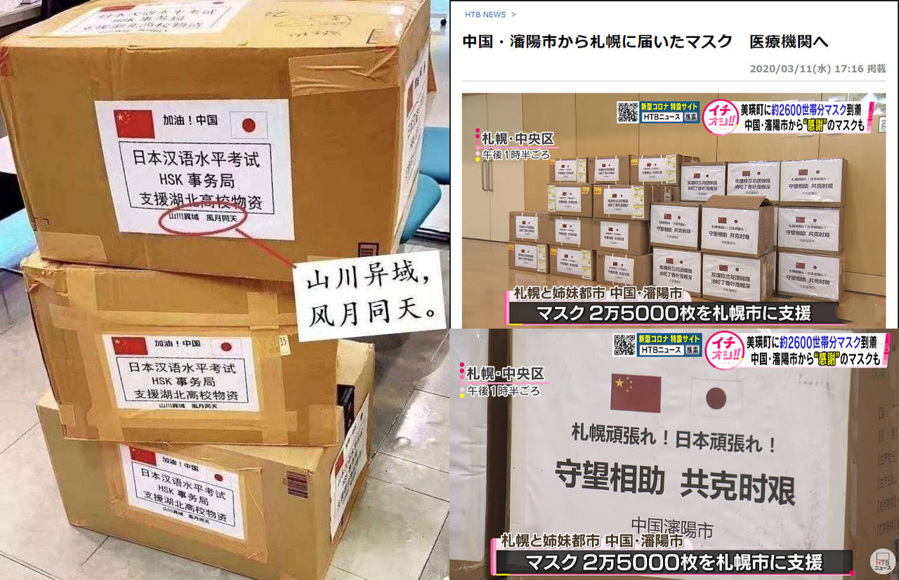 2020年2月新冠疫情正在中国大地肆虐,日本自发向我国捐赠了不少医疗物资,捐赠箱上“山川异域,风月同天”8个字感人肺腑,截至2020年2月7日,日本各界向中国捐赠的防护口罩数量已突破630万个,累计捐款达3060万元人民币。