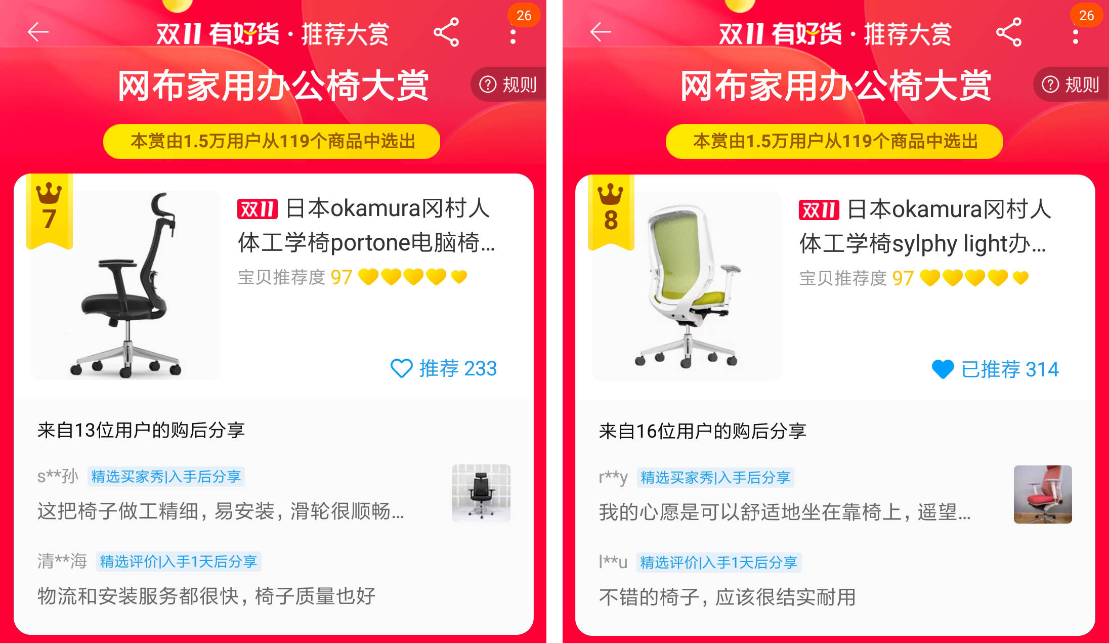 2020年11月9日的天猫“双11有好货·推荐大赏”,由1.5万用户从119个商品中选出的“网布家用办公椅大赏”子榜单中,Okamura旗下的Portone电脑椅名列第7位,Sylphy Light电脑椅名列第8位,能在天猫众多座椅产品中排名前十位,可见Okamura座椅的优异品质。