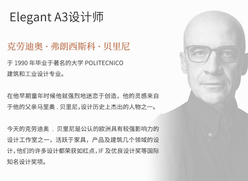 意大利设计师克劳迪奥·弗朗西斯科·贝里尼,他在米兰生活和工作, 于1990年毕业于著名的大学Politecnico建筑和工业设计专业。在他早期童年时候他就强烈地迷恋于创造,他的灵感来自于他的父亲马里奥·贝里尼,设计历史上最杰出的人物之一。今天的克劳迪奥·贝里尼是公认的欧洲最具影响力的设计工作室之一,活跃于家具,产品及建筑几个领域的设计,并与世界领先的公司如Walter Knoll; Steelcase; Poltrona Frau; Riva 1920合作。他们的许多设计都荣获如红点,IF及优良设计奖等国际知名设计奖项。