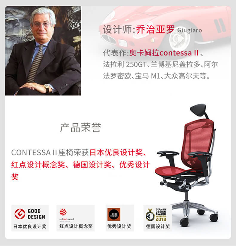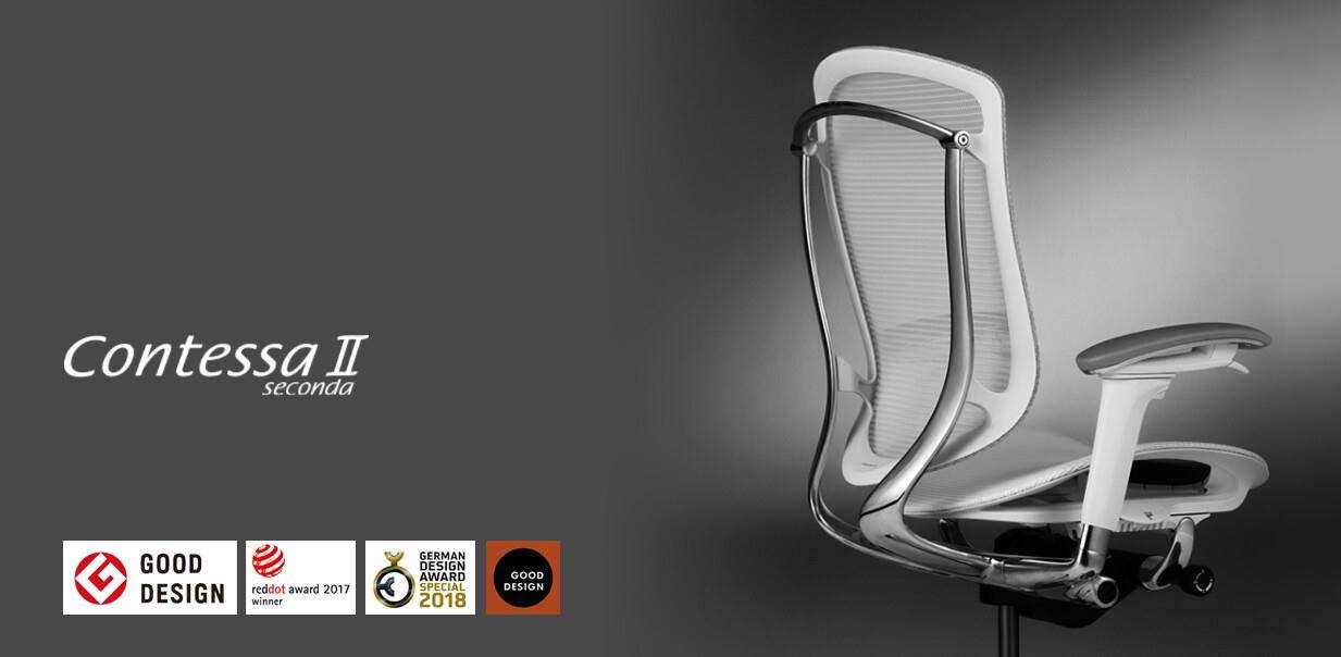 2017年全球上市的第二代产品Contessa II seconda在坐垫、网布、扶手等方面进行了改良,更推出了椅脚、头枕、衣架、腰靠等多种个性化订制服务,一经发售就获得日本Good Design Award大奖、2017年德国Reddot Award红点奖、2018年The German Design Award德国特殊设计奖等奖项。