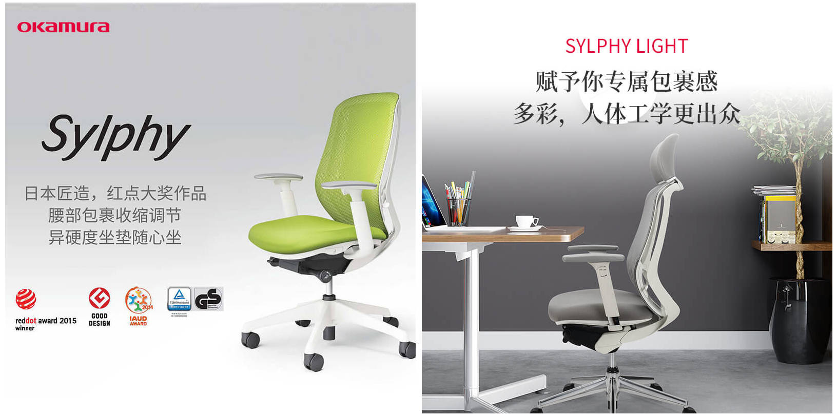 Okamura株式会社オカムラ经过多年的潜心研究,于2014年推出全新的概念座椅Sylphy,以可调贴合背部曲线、适合任何体型的独特设计和创新的异硬度坐垫获得全球客户认可,陆续斩获2014年IAUD奖,2015年德国Reddot Award(红点奖),Good Design Award(日本优良设计大奖)等本土和国际大奖。